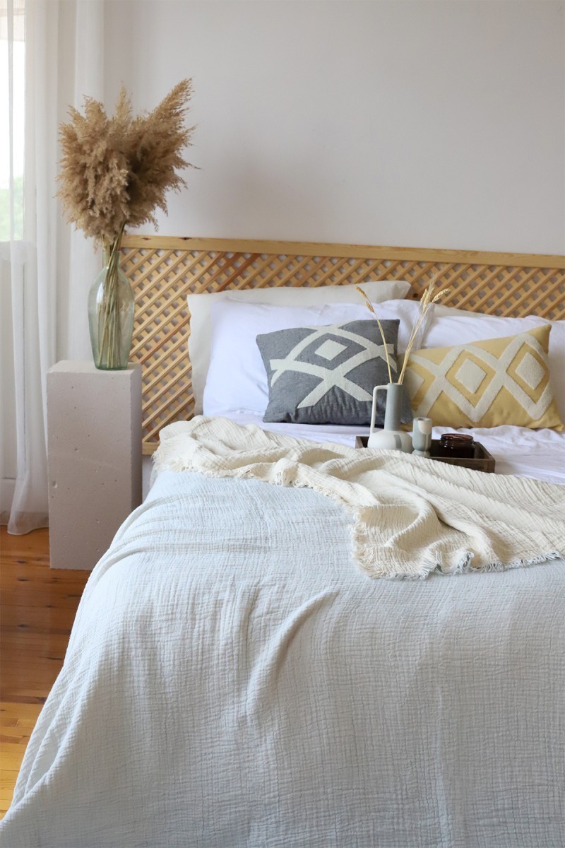 Ürün Bilgisi: Çift Kişilik 4 Kat Müslin Çift Taraflı İplik Boya Yatak Örtüsü
