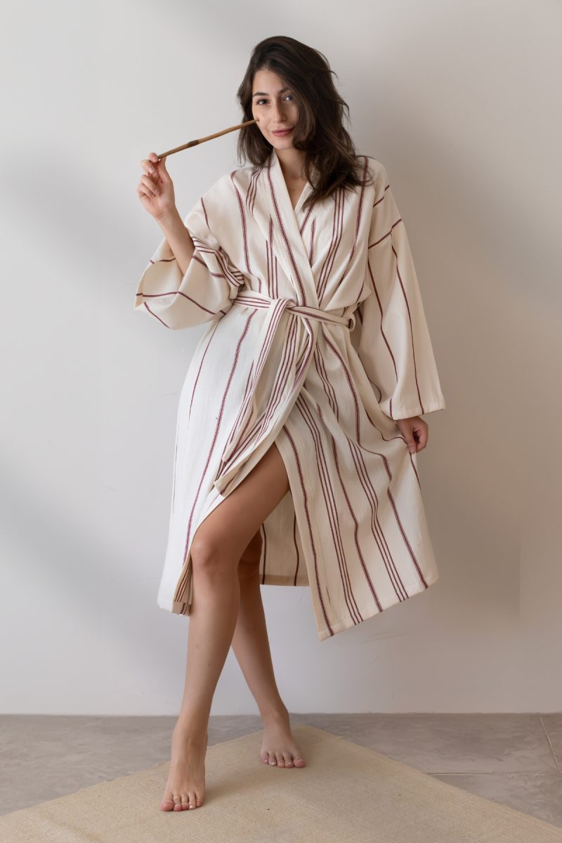 Ürün Bilgisi: El Dokuması %100 Pamuklu Peştemal Kimono Bornoz Çizgili (Kara Tezgah)