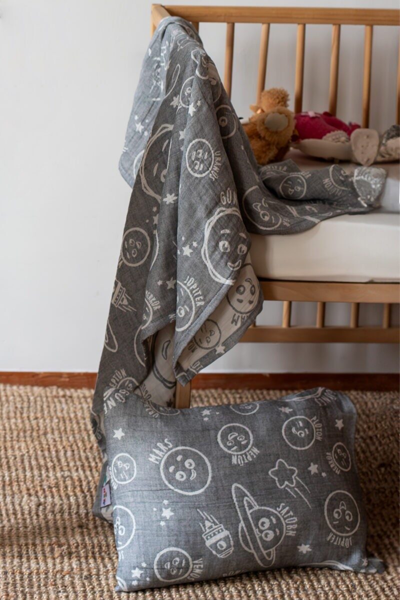 Kumaş Özellikleri: Miniyo 3 Kat Jakarlı Müslin Pamuklu Bebek Çocuk Battaniye Yastıklı Set