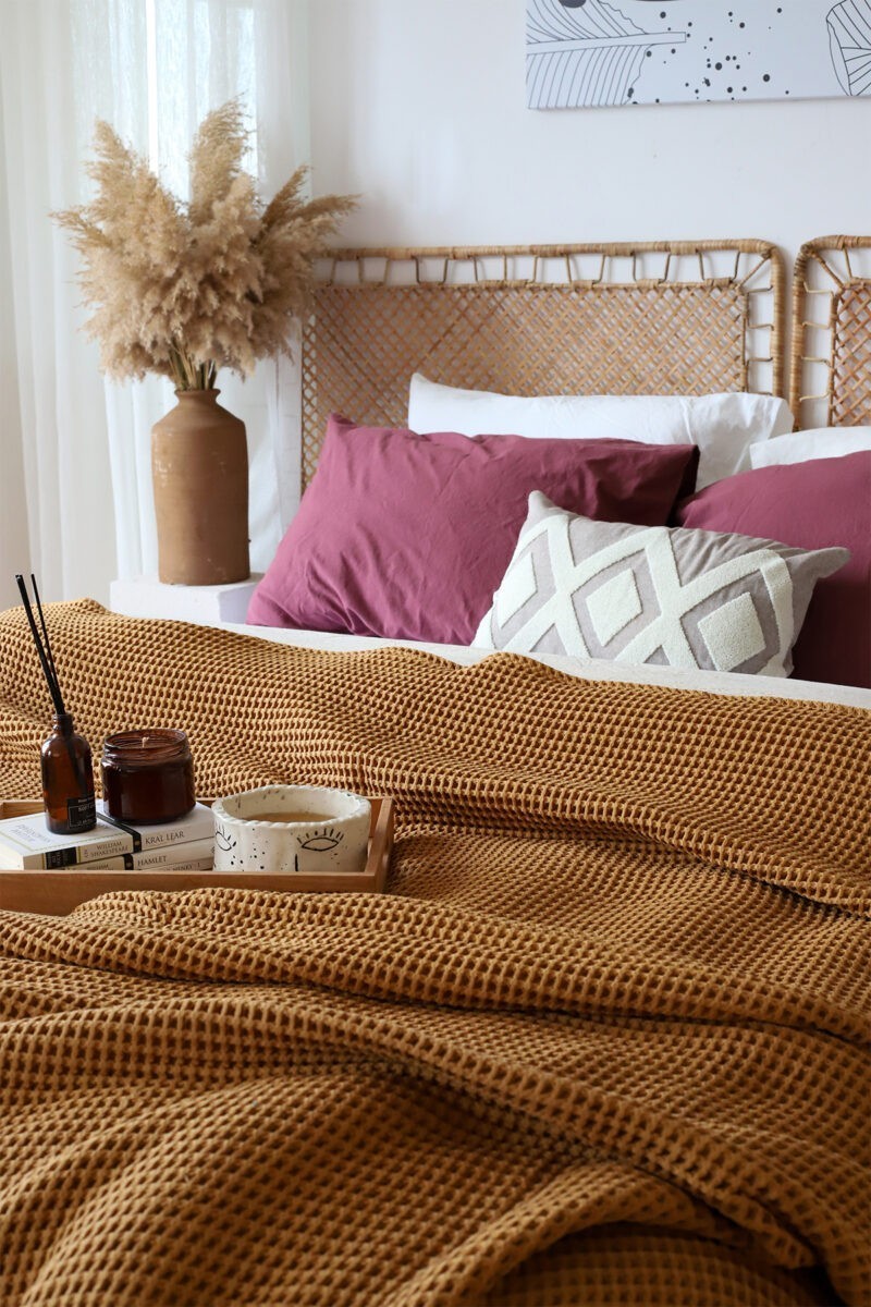 Waffle Pike Pamuklu Yatak Örtüsü Karamel