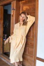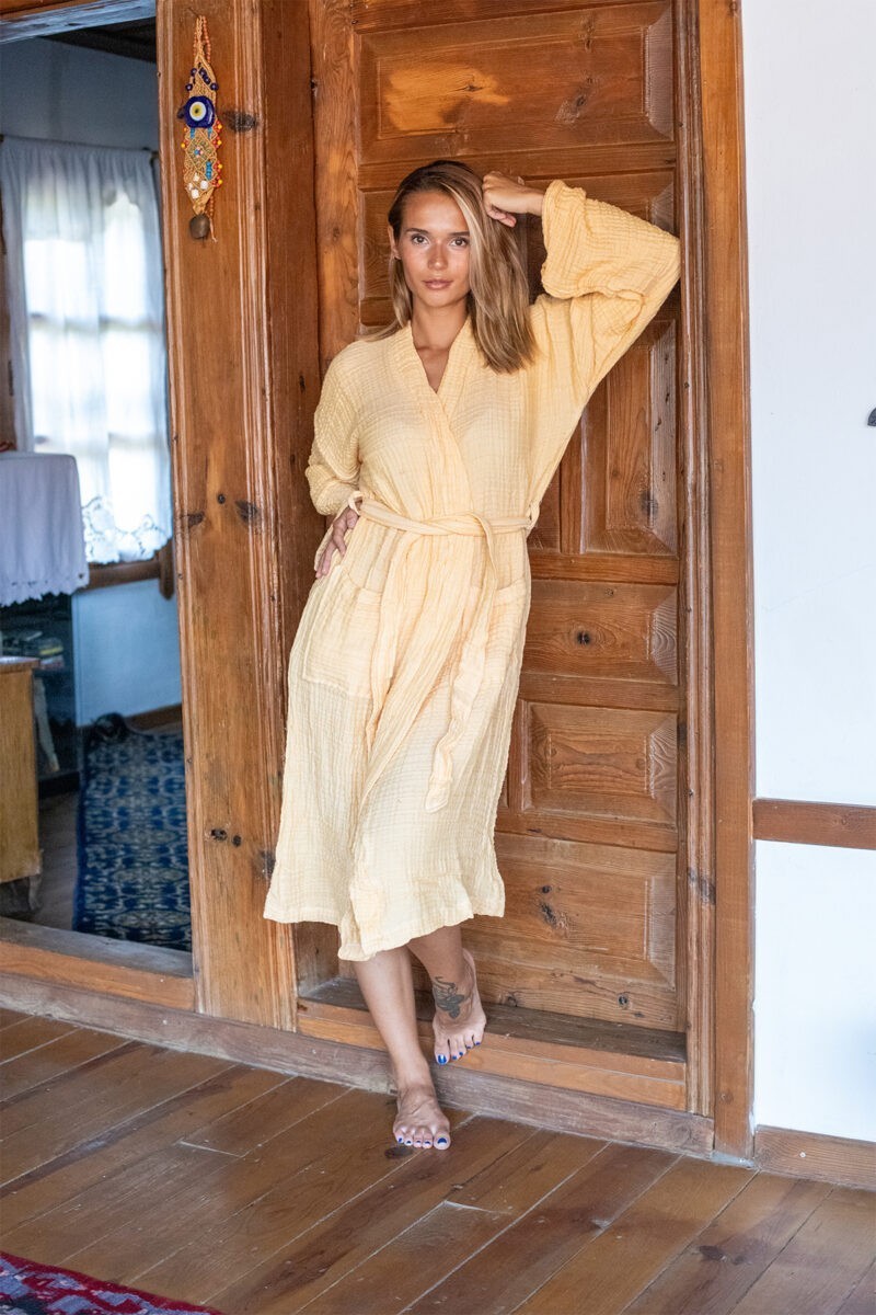 Yetişkin İplik Boya 4 Kat Müslin Pamuklu Bornoz Hardal Sarı